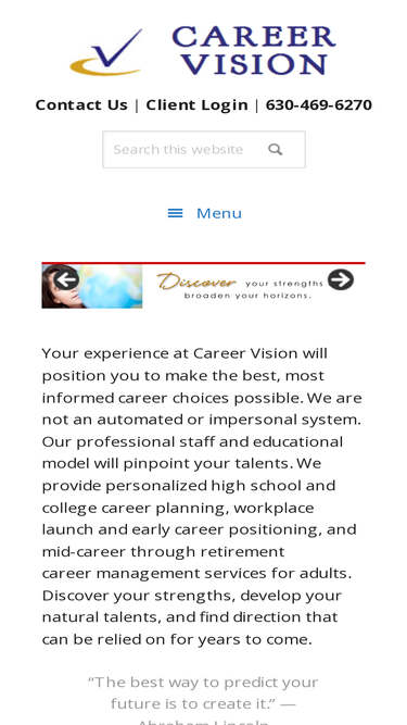 75%Your experience at Career Vision will position you to make the best, most informed career choices possible. We are not an automated or impersonal system. Our professional staff and educational model will pinpoint your talents. We provide personalized high school and college career planning, workplace launch and early career positioning, and mid-career through retirement career management