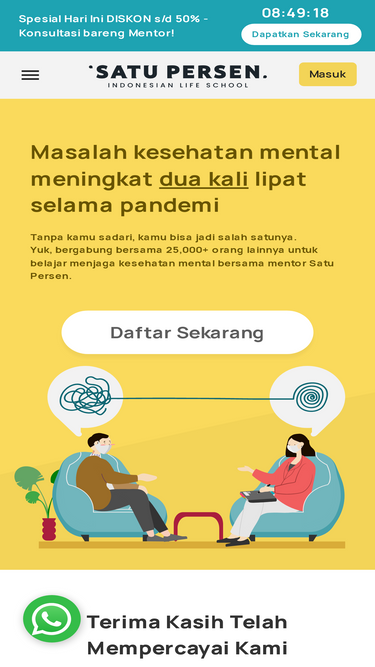 62%Solusi atasi kecemasan, overthinking, insecure, dan masalah kesehatan mental lainnya. Gabung bersama 20.000+ lainnya bantu dirimu lebih baik setiap harinya.