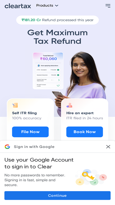 Login to File Income Tax Returns (ITR) for FY 2024-25 (AY 2025-26) online with ClearTax. ClearTax is fast, safe and easy for ITR E-Filing. ClearTax handles all cases of Income from Salary, Interest Income, Capital Gains, House Property, Business and Profession. Maximize your deductions by handling all deductions under Section 80 & the rest. Trusted by hundreds of CAs and corporations for filing taxes and TDS.