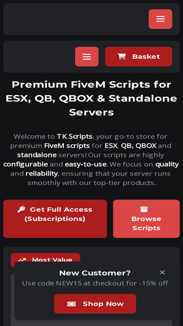 68%TK Scripts provides the best premium FiveM scripts for ESX, QBCore, QBOX and standalone servers. Our catalog offers a wide variety of unique and quality scripts