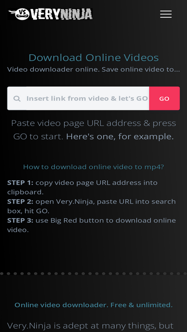 very.ninja is video downloader online. save online videos to your smartphone, laptop or desktop in mp4 format. watch offline without ads and interruptions.