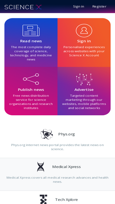 75%Science X network: Science X is a network of high quality websites with most complete and comprehensive daily coverage of the full sweep of science, technology, and medicine news