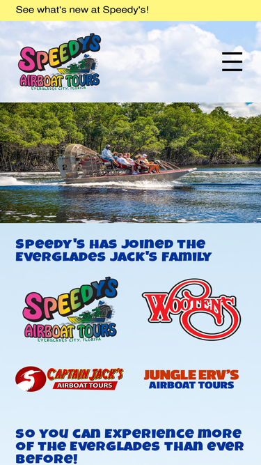 66%Speedy's has joined the Everglades Jack's Family so you can Experience more of the Everglades than ever before! Zip through Everglades City on airboats NEW! Take a buggy into a cypress forest NEW! Get 2-way headsets on select tours NEW! Have more fun with combo tours NEW! See alligators & animals up close NEW! Hold a baby alligator NEW! Explore ...