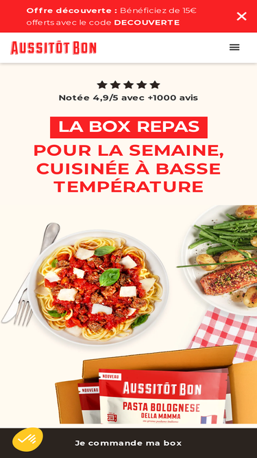 92%Aussitôt Bon propose des plats cuisinés par des chefs, préparés en cuisson sous‑vide à basse température, livrés à domicile en France. Découvrez une cuisine de qualité, saine et pratique, avec une note Trustpilot de 4,9/5.