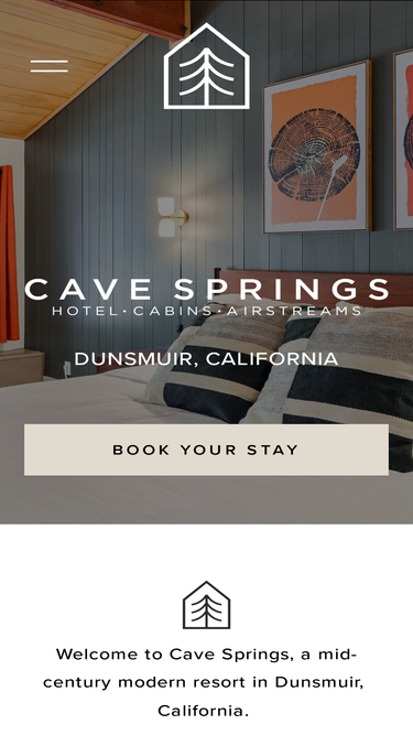 60%Cave Springs is a mid-century modern boutique resort in Dunsmuir, California, located just off the I-5. Our hotel is nestled up to the Sacramento River, a premiere fly fishing location, and only minutes away from countless waterfalls and hiking trails like Castle Crags State Park. With Mt. Shasta Wi