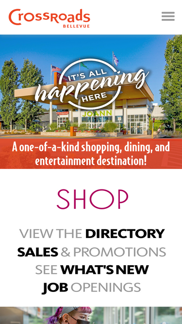 81%crossroads shopping center is a one-of-a-kind shopping, dining, and entertainment destination featuring a unique mix of shops, 30 international restaurants, a performance stage featuring live music every weekend, an 8-screen cinema, a rock climbing gym, vintage kids' rides, a farmers market, a public library, a mini city hall, spa, health & beauty services, art classes, senior living, and so much more.