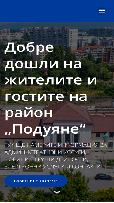 87%УСЛУГИ Тук сме събрали всички административни услуги, за които, Вие, гражданите на района ни питате или ползвате най-често. Моля, имайте предвид, че много от тях са отговорност на други институции, чиито контакти сме се погрижили да обновим, за да задавате въпроси или подавате сигнали без посредници. Избори НС 2024 Електронни услуги ГРАО Строителство Отчуждаване Социални