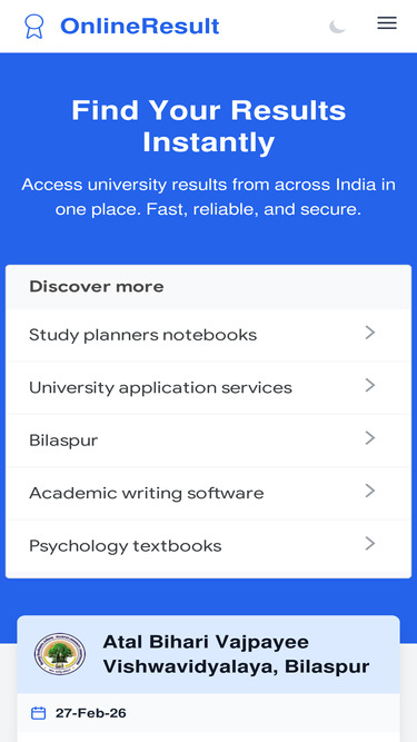 100%Official web portal of bilaspur,SNPV,sarguja and Ayush University for publishing several streams of Science, Arts, Commerce, Law and Education exam result