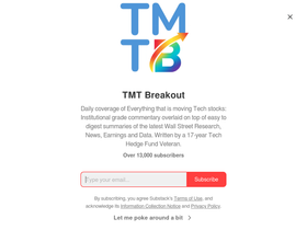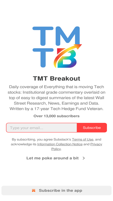 71%Daily coverage of Everything that is moving Tech stocks: Institutional grade commentary overlaid on top of easy to digest summaries of the latest Wall Street Research, News, Earnings and Data. Written by a 17-year Tech Hedge Fund Veteran. Click to read TMT Breakout, a Substack publication with tens of thousands of subscribers.
