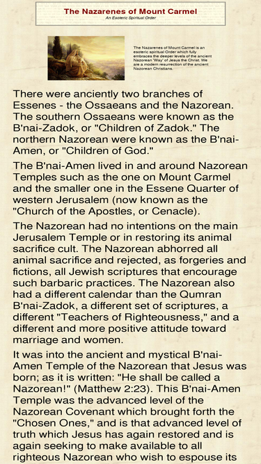 91%the nazarenes of mount carmel is an esoteric spiritual order which fully embraces the deeper levels of the ancient nazorean 'way' of jesus the christ. we are a modern resurrection of the ancient nazorean christians.