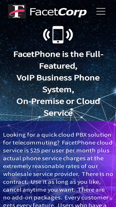 86%FacetCorp is the creator of FacetPhone, an IP-PBX phone system that runs on Mac or Linux including call center features and an advanced mobile app.