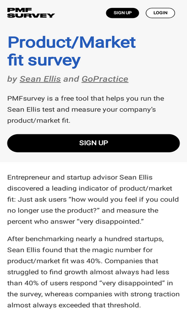 71%PMFsurvey is a free tool that helps you run the Sean Ellis test and measure your company’s product/market fit.