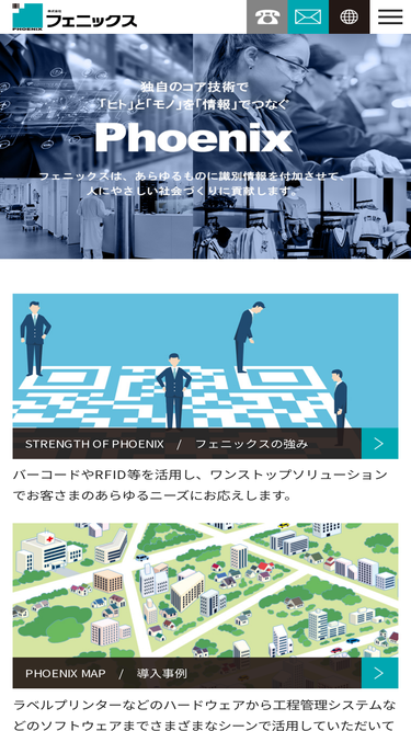 76%フェニックスは、あらゆるものに識別情報を付加させて、人にやさしい社会作りに貢献します。創業以来培ってきた“プリント技術”“用紙搬送技術”“自動認識技術”で、お客様のあらゆるニーズにお応えします。