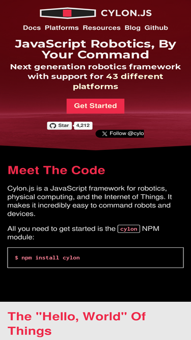 88%cylon.js is a javascript framework for robotics, physical computing, and the internet of things using node.js. it provides a simple, yet powerful way to create javascript robots that incorporate multiple, different hardware devices at the same time.