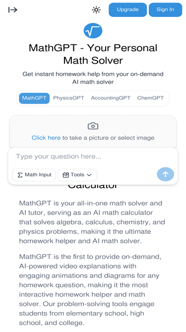 Mathos AI (MathGPTPro) is among the best and most powerful free AI math solvers and calculators, trusted by over 2 million students worldwide. Instantly solve any problems in graphing, fractions, algebra, derivatives, physics, engineering, chemistry, and more with the #1 AI math tool.