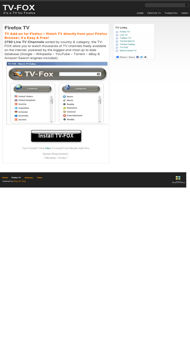 tv add-on for firefox - watch tv directly from your firefox browser, it's easy & free! 2780 live tv channels sorted by country & category, the tv-fox allow you to watch thousands of tv channels freely available on the internet. powered by the biggest and most up to date database (google - wikipedia - youtube
