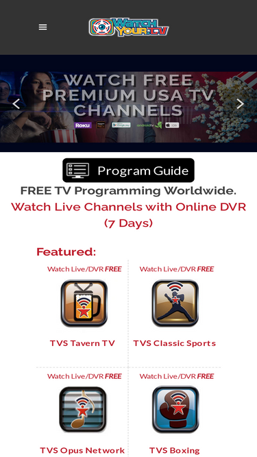 94%watchyour.tv - watch free premium usa tv channels live with recorded 7 days dvr (catch-up). never miss any program. watchyour.tv is an over-the-top television streaming service with the most comprehensive usa based content. watch your favorite programming on ios,ipad, android mobile, web browsers, roku, apple tv, android tv, amazon fire tv and apple tv.