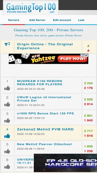 biggest top list for private servers. join our high traffic top list and we can guarantee you more traffic for free.