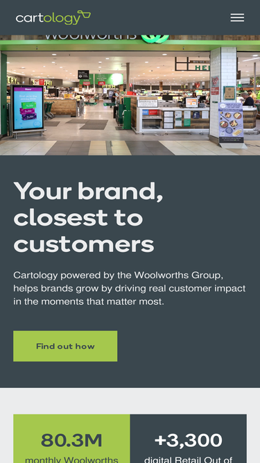94%At Woolworths, Cartology harnesses data insights to create impactful advertising solutions that reach customers where they shop, enhancing brand visibility and influencing purchasing decisions.