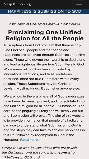 91%information on submission to god (islam in arabic) based on the quran. introduction to the principles of submission. articles on the purpose of our creation, worship practices, status of women in islam, hadith and sunnah, and heaven and hell and peaceful co-existence. read quran, or download quran. - masjid tucson.org