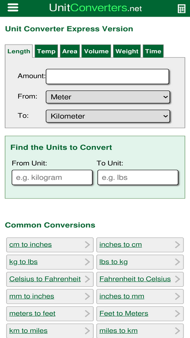 85%quick, free, online unit converter that converts common units of measurement, along with 77 other converters covering an assortment of units. the site also includes a predictive tool that suggests possible conversions based on input, allowing for easier navigation while learning more about various unit systems.