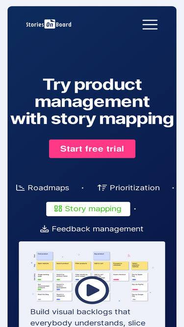 93%Lightweight Product Management Tool. Built around story mapping, created for product teams. Real-time, two-way JIRA, Trello, GitHub, and Azure DevOps integration. Try StoriesOnBoard Free. Try StoriesOnBoard for Free.