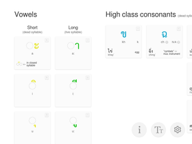 85%This web app has voiced over tiles for consonants, vowels, digits, tone marks and other glyphs. It is featured with sorting and filtering, multiple notations for transcribed text and other settings.