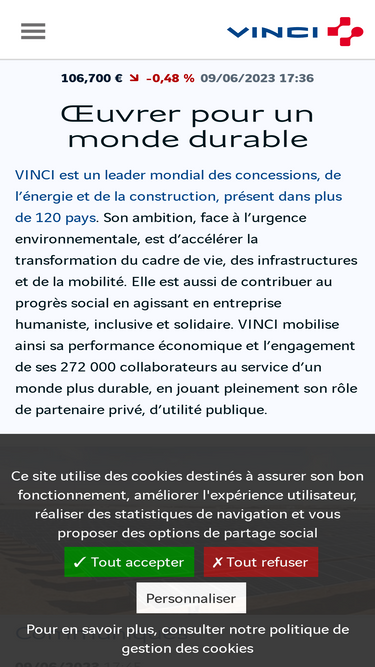 90%présent dans plus de 120 pays et au cœur des enjeux du monde contemporain, l'ambition de vinci est de contribuer activement à la transition énergétique et environnementale du cadre de vie, des infrastructures et de la mobilité. elle est aussi de participer au progrès social en agissant en entreprise humaniste, inclusive et solidaire.