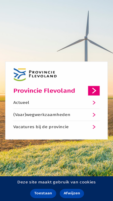 87%welkom op de website van provincie flevoland. wij zijn op werkdagen telefonisch bereikbaar tussen 8:30 en 17:00 uur via 0320 - 265 265. zoekt u toeristische informatie? bezoek dan de website van visit flevoland.