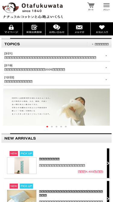 75%ナチュラルコットンと心地よいくらし。それが「おたふくわた」の商品を通じて、私たちがお届けしたいものです。 1840(天保11)年、初代・原田忠右衛門によって、博多の地で私たちは創業しました。1902(明治35)年には、商品名を「おたふくわた」と改称。当時は、嫁入り道具として、母や祖母が娘のために心を込めて木綿ふとんをこしらえるのが一般的でした。そんな愛情と幸せを願う気持ちとが込められた木綿のふっくらしたイメージと福々しい「おたふく」のイメージとが重なり、この名前が生まれたのではないでしょうか。 1997(平成9)年には、市場の混乱などを受け、一度はふとんをはじめとする綿関連の事業から撤退したものの、6年後の2003年には「おたふくわた」ブランドを復活。おたふくの名前に込められた思いと伝統を大切にしながら、ナチュラルコットンにこだわったものづくりに取り組んでいます。