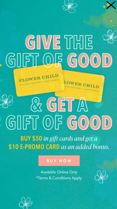 78%Flower Child offers fresh, healthy food made with real ingredients. Enjoy bowls, salads, wraps, and seasonal dishes. Order online, join our rewards program, and find a Flower Child near you.