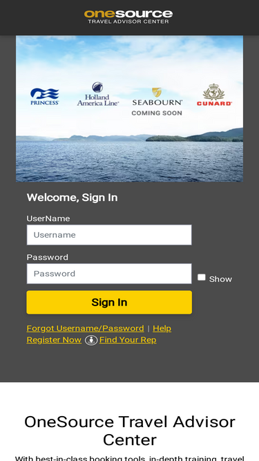 with best-in-class booking tools, in-depth training, travel advisor rates, and much more, onesource travel advisor center is built to help you succeed. register with onesource and connect directly with princess cruises, holland america line, seabourn & cunard.