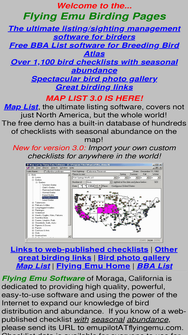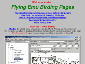 the flying emu birding pages have hundreds of seasonal bird checklists, elegant and friendly map list software that records your sightings anywhere in the world by point and click on a map, and spectacular bird photos."<