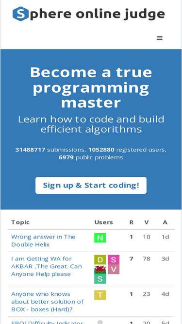 82%SPOJ (Sphere Online Judge) is an online judge system with over 315,000 registered users and over 20000 problems. The solution to problems can be submitted in over 60 languages including C, C++, Java, Python, C#, Go, Haskell, Ocaml, and F#. SPOJ has a rapidly growing problem set/tasks available for practice 24 hours/day, including many original tasks prepared by the community of expert problem setters associated with the project.