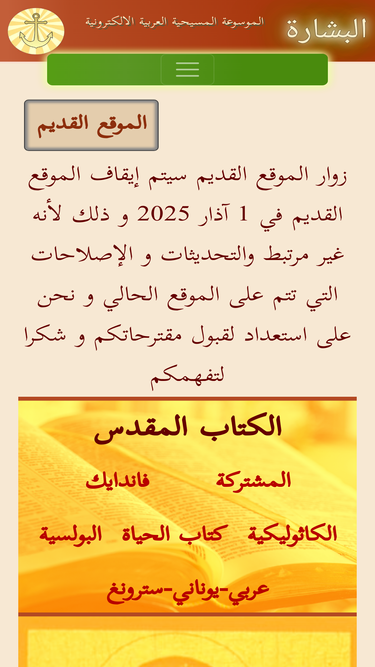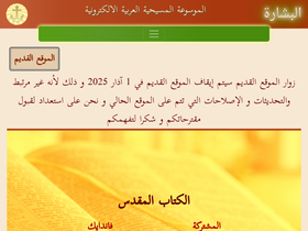 100%البشارة الموسوعة المسيحية العربية الإلكترونية www.albishara.net موقع إلكتروني يحتوي على * الكتاب المقدس باللغة العربية عدة ترجمات واللغة السريانية واليونانية والعبرية والإنكليزية والفرنسية * مجموعة من القواميس وقاموس سترونغ للغة اليونانية * دليل الكنائس العربية والمنسية * دليل الإعلام : يحتوي دليل الكتب سمعي بصري : دليل مواقع راديو وتلفزيون دليل المواقع الإلكترونية * مجموعة من الأيقونات والصور * دراسات كتابية : الإبحار في الكتاب المقدس لكافة اللغات مقارنة بين الترجمات العربية يعرض الأيات المطلوبة لكل الترجمات العربية مقارنة بين ترجمة عربية ولغة غير عربية يعرض الأيات المطلوبة بين لغتين عرض متقدم شاقولي ومستمر كامل للكتاب لمقدس مع إحصائيات مجموعة من الخرائط مع الشرح للمواقع فيها * البحث ويشمل: بحث عن كلمة في الكتاب المقدس يعطي النتيجة في تواجد الكلمة في الأيات بحث عن أيات حسب رقم السفر أو الفصل المحدد بحث عن كلمة في القواميس بحث عن كنيسة حسب إسمها بحث عن كتاب حسب اسم الكتاب أو المؤلف أو دار النشر أو سنة الإصدار