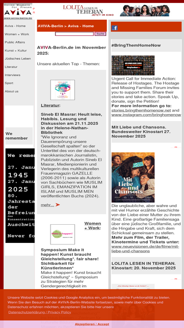 86%Frauenzeitschrift, Frauen-Magazin, Frauen-Netzwerk, Online-Magazin, Berliner Frauenmagazin, Kinofilmrezensionen, Buchrezensionen, Community, Konferenzen, Mentoring, Workshop, Coaching, Seminare, Mentoring, Award, Contest, Blog, Startup, Kreativwirtschaft, Musik, MINT, Engineering, Themen: Investition, Entrepreneurship, Leadership, Development, Programmieren, Jobs, Familie, Beratungen, Frauen, Jüdisch, Jewish, Journalistin und Fotografin Sharon Adler, AVIVA, Aviva, aviva, AVIVA Berlin, aviva-berlin, Aviva-Berlin, Künstlerinnen, Sichtbarkeit von Frauen, Frauen im Literaturbetrieb, Digital Media, Online-Journalistinnen, Women + Work - Veranstaltungen für Unternehmerinnen, Freiberuflerinnen, Angestellte, arbeitslose oder geflüchtete Frauen, Veranstaltungen bei Raupe und Schmetterling - Frauen in der Lebensmitte e.V., im FrauenComputerZentrumBerlin, der Friedrich-Ebert-Stiftung, der Gründerinnenzentrale, Akelei - Berufswegplanung mit Frauen, das finanzkontor Kindler, Korth & Kolleginnen, BEGINE, dem Bildungswerk Berlin der Heinrich-Böll-Stiftung e.V., von Frauenkreise, Interkulturelles Frauenzentrum S.U.S.I., Frauenzentrum Paula Panke, alpha nova, Feminismus, Frauenbewegung, Equal Pay Day, Biographien, Dokumentarfilme von Frauen, Ausstellungen in Berlin, #frauenzählen, Start für den neuen Genderreport der Buchbranche, Berliner Unternehmerin des Jahres, Frauenwahlrecht - Parität in der Politik, Berliner Frauenpreis, Digital Empowerment, Antisemitismus, Gleichstellungspolitisches Rahmenprogramm (GPR), feministische Literatur, Provenienzforschung und Restitutionspraxis, §219a StGB, Enteignung der jüdischen Bevölkerung Europas, Lesbengeschichte, Jüdische Frauenbiographien, Exilliteratur, Regisseurinnnen, Filmemacherinnen, Frauenbewegung, Pro Quote.Gender Datenreport