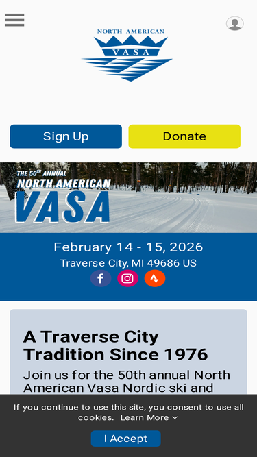97%The 50th Annual North American Vasa Festival of Races is on Saturday February 14, 2026 to Sunday February 15, 2026. It includes the following events: 50k Classic/Freestyle, Okerstrom Kortelopet 12k Freestyle Race, George Kuhn Half Marathon 27k Freestyle Race, Jr Vasa, Bigfoot Community Relay (Sponsored by Cross Country Ski HQ), Adaptive Skiers, Mark Esper 6k Classic High School, Lombard Loppet 15k Classic, Vasa Tour 6k Classic/Freestyle, Fatbike 25k, Okerstrom Kortelopet 12k Freestyle (High School), and Mark Esper 6k Classic Citizen Racer (Not High Schoolers).