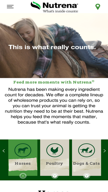 Nutrena has been making every ingredient count for decades. We offer a complete lineup of wholesome products you can rely on, so you can trust your animal is getting the nutrition they need to be at their best. Nutrena helps you feed the moments that matter, because that's what really counts.