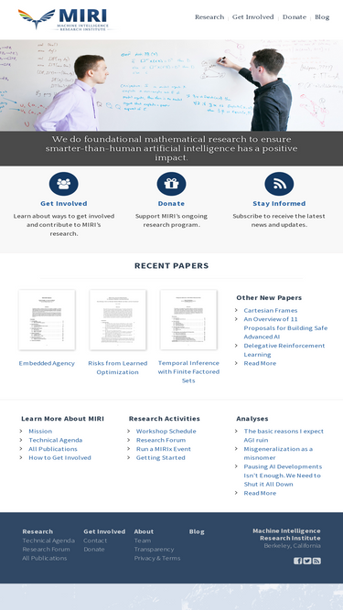 100%MIRI's artificial intelligence research is focused on developing the mathematical theory of trustworthy reasoning for advanced autonomous AI systems.