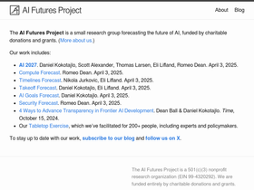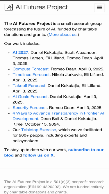 85%The AI Futures Project is a 501(c)(3) nonprofit research organization (EIN 99-4320292). We are funded entirely by charitable donations and grants.