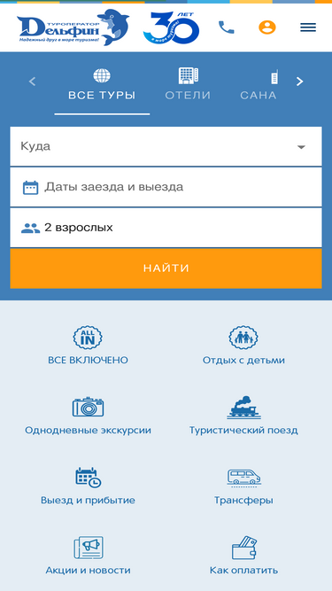 путешествия от туроператора дельфин. путевки в санатории, экскурсионные туры, круизы. отдых на море, за городом, походы в горы, сплавы по рекам. туры можно приобрести у 8000 турагентов в 700 городах.
