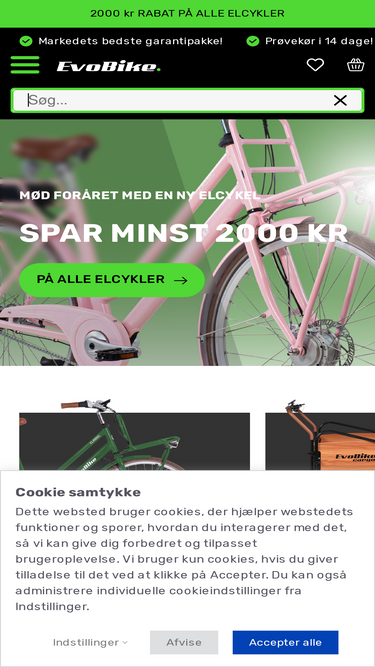 87%Hos EvoBike.dk finder du en alsidig kollektion af elcykler til alle behov. Udforsk vores udvalg af kvalitets- og overkommelige elcykler med avanceret design.