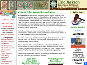 74%eric jackson has been buying and selling revenue stamps since 1970. we specialize in revenue stamps of the united states and possessions, taxpaids, state revenues, canada revenues, amg revenues, u.s. and canada telegraph stamps, u.s. local post stamps, revenue stamped paper, and much more. we also maintain an inventory of philatelic literature pertaining to revenue stamps of the world. we invite you browse our online inventory, which is the largest and most comprehensive in the world. if you don't find what you are looking for, please let us know and we will attempt to locate it for you. our online auction may also be of interest to you. every three weeks we offer over 200 lots of u.s. revenues and many other interesting items as well as occasional world revenue stamps. we are members of the american revenue association, state revenue society, american stamp dealers association, american philatelic society, collectors club new york, the revenue society, and many other philatelic organizations.