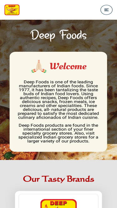 100%Previous Next DEEP has the most original tastes of traditional India. No compromise is made in producing the most authentic vegetarian flavors of Indian Cuisine. Deep has following lines of products under its name. Appetizers Breads North Indian Meals South Indian Meals Vegetables (Quick Frozen) Savory Snacks Pickles Spices Dals […]