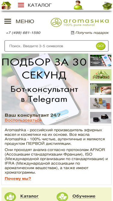 67%«Аромашка» - обучающий портал по ароматерапии, интернет-магазин и российский производитель аутентичных эфирных и базовых масел, а также натуральной косметики на их основе.