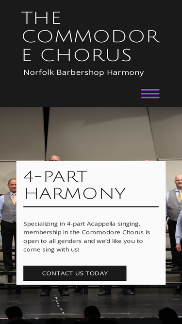 100%4-part harmony specializing in 4-part acappella singing, membership in the commodore chorus is open to all genders and we'd like you to come sing with us! contact us today about our chorus the commodore chorus is the performing chorus of the norfolk, virginia chapter of the barbershop harmony society, a 501(c)(3) organization based in nashville,