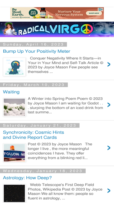 Astrological writer Joyce Mason is the "Radical Virgo," your flight attendant on many round trips from Earth to Sky. This blog is about developing the best potential of your star map, whatever your signs or signatures. Better You = Better World.
