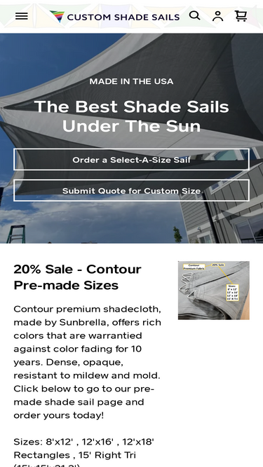 92%Pre-made and custom-sized fabric shade sails for patio, pool, and other outdoor use. Made in the USA. +10,000 sails in 15+ years!