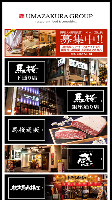 68%馬桜(うまざくら)は熊本の馬肉料理専門店です。馬肉を使った馬刺し、しゃぶしゃぶ、すき焼き、焼肉、創作馬肉料理をお楽しみ頂けます。桜肉のことなら馬肉ダイニング馬桜におまかせください。