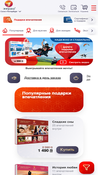 76%подарить эмоции в подарок теперь можно с помощью магазина впечатлений в подарок эмпрана в санкт-петербурге. лучший подарок - эмоции, впечатления то, что ваши любимые и друзья запомнят навсегда. купить впечатления в подарок или подарочный сертификат можно онлайн в интернет магазине впечатлений, а также заказать доставку.